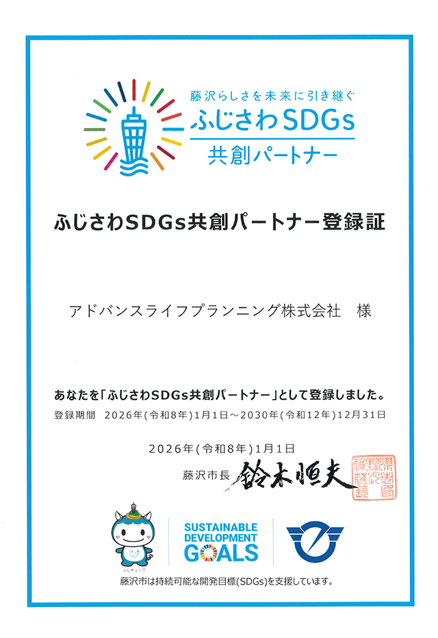 このたび、アドバンスライフプランニング株式会社は、2026年1月1日付で神奈川県藤沢市が推進する「ふじさわSDGs共創パートナー」に登録されました。