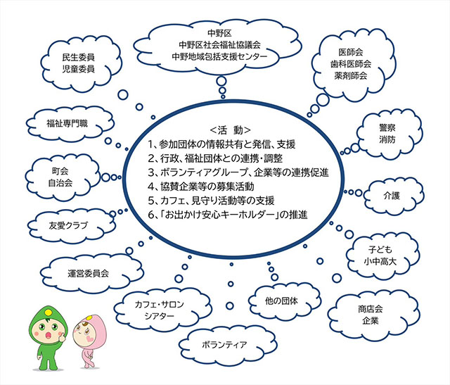 「みま~も桃園」は、住民、行政、専門職、民間企業が連携し、誰もが生きがいを持って楽しく安心して暮らせる仕組みづくりを行うネットワークです。