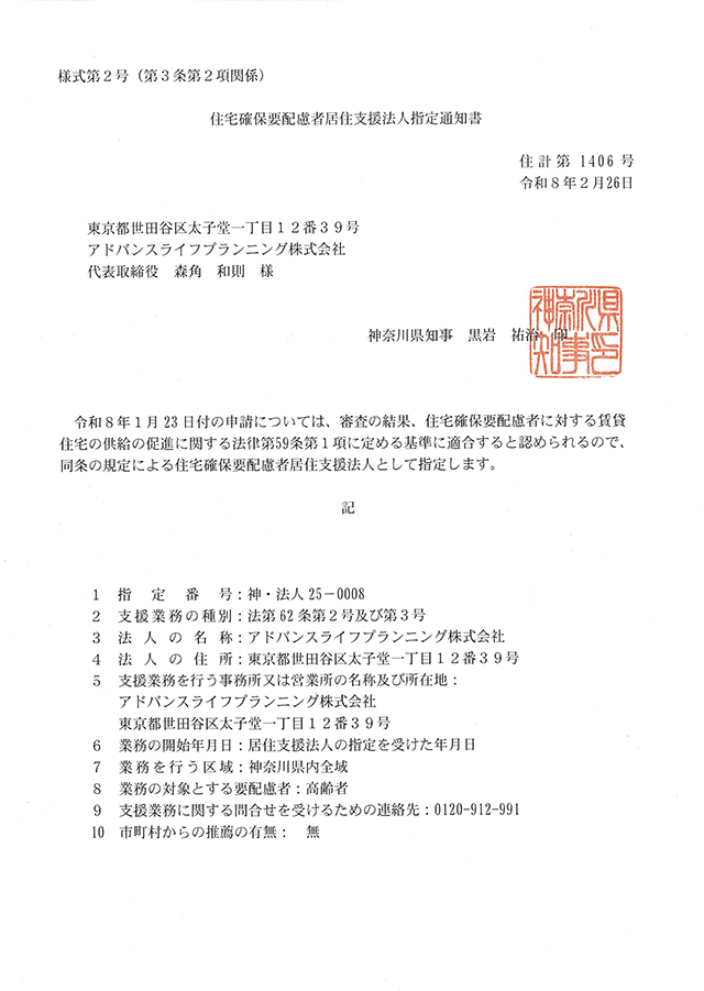 アドバンスライフプランニング株式会社(本社:東京都世田谷区、代表取締役:森角和則、以下「当社」)は、令和8年2月26日付で、神奈川県知事より「住宅確保要配慮者居住支援法人」の指定(指定番号:神・法人25-0008)を受けたことをお知らせいたします。